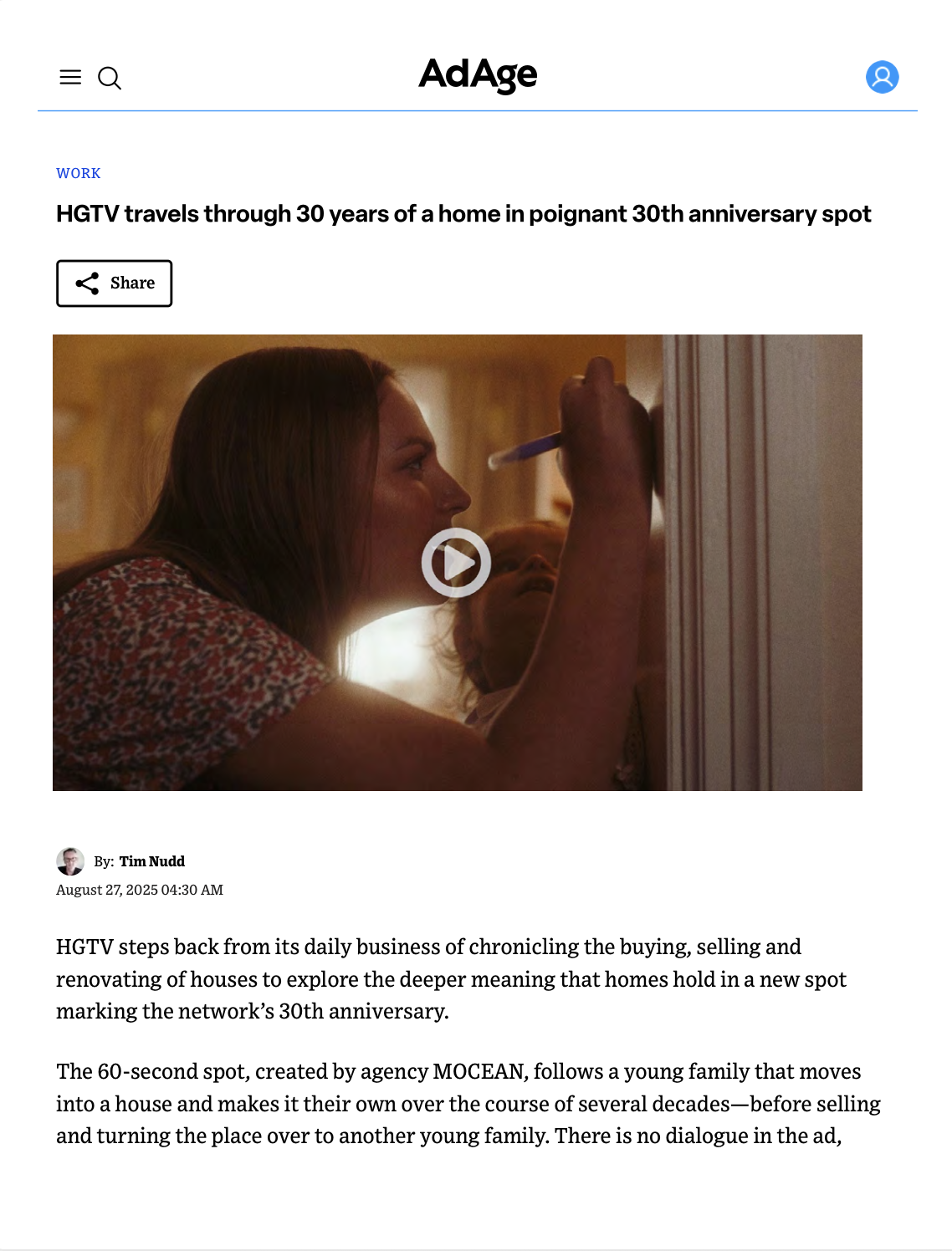 AdAge: “HGTV travels through 30 years of a home in poignant 30th anniversary spot” | Written by Tim Rudd